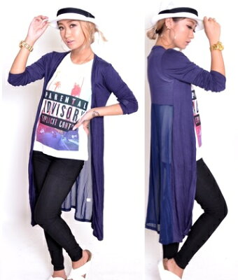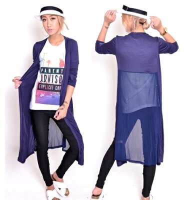 【メール便送料無料】超ロングカーディガン ストレッチメッシュ切替 長袖カーディガン(ネイビー)カジュアルは勿論ドレススタイルにも【長袖 マキシカーディガン 七分袖 ワンピース 羽織り ボヘミアン】