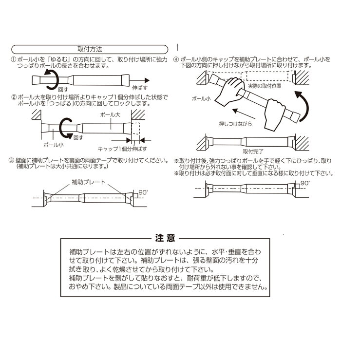 ・寸法 伸縮サイズ:72〜120cm ポール径:28mm・耐荷重:ポール使用長さ72〜90cm:20kg(補助プレート使用) ポール使用長さ91〜110cm:18kg(補助プレート使用) ポール使用長さ111〜120cm:16kg(補助プレート使用)