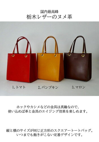 メイドインジャパン 品名:スクエアートートバッグ 素材:ヌメ革/オルタ 品番:HMK-RE012 小売価格:\29,700- (本体価格 \27,000-) サイズ:W23cm/H23cm/D13.5cm カラー:左1.トマト 中2.パンプキン 右3.マロン 【ご注意】 撮影時の光の加減やモニターの発色の具合によって実際のものと色が 異なる場合がありますので十分にご了承お願い致します。